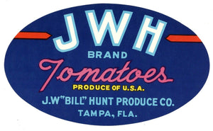 JWH Brand Vintage Tampa Florida Vegetable Crate Label, oval
