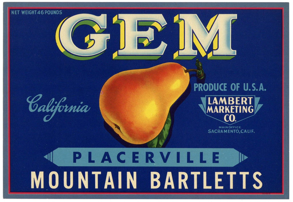 Gem Brand Vintage Placerville Pear Crate Label