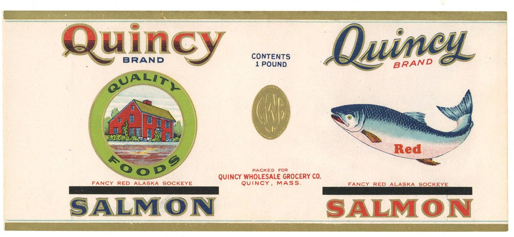 This antique can label was used by Quincy Wholesale Grocery Co., Quincy, Massachusetts. Early embossed label with gold trim, image of John Quincy Adams home. Alaska salmon packed under a store name. This version has an overprinted area.