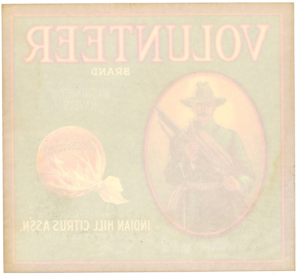 This citrus crate label was used by Indian Hill Citrus ASS'N. Image of volunteer holding rifle.
